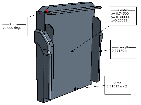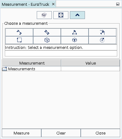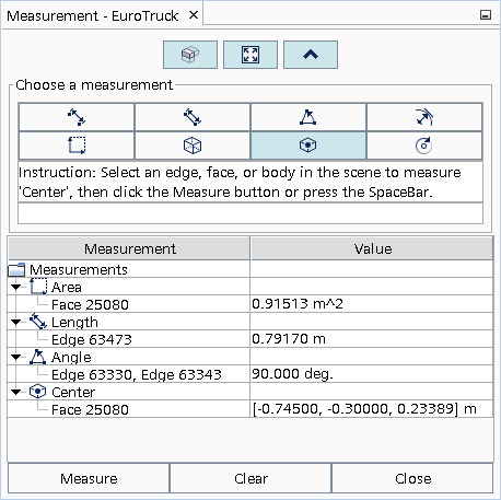 The measurement tool computes geometric quantities for selected entities in the 3D-CAD model. For example, it lets you compute the distance between two entities, the volume of a solid body, the area of a face or a body, the radius of an arc, and other quantities.