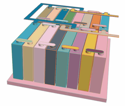 起始模拟文件中的初始几何仅包含放置在板上的一个电池电芯和一组初始极耳。使用预定义的线性阵列网格操作可跨板对电芯和极耳进行阵列。
