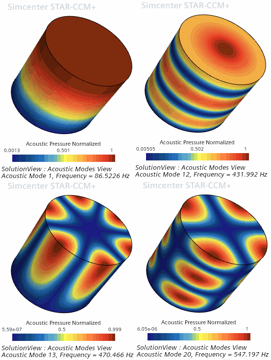 注 The Acoustic Pressure Normalized field function is only available when using the . Otherwise, you can create a scalar scene/displayer for each acoustic mode and use the different Acoustic Pressure Normalized - Mode [n] field functions in each scene/displayer. For example, the following images show a sample of acoustic mode shapes for a closed cylindrical domain:
