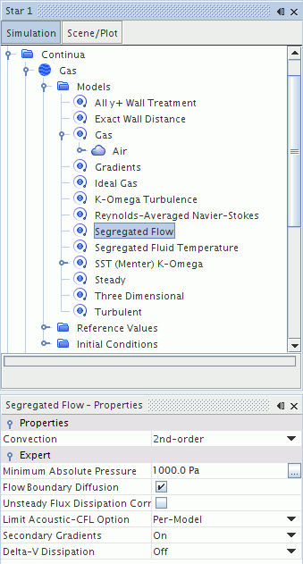 某些模型节点的属性可以在属性窗口中设置。这些属性设置了应用父连续体的所有区域中的模型默认行为。如果提供了适当的控制,则可在区域或边界级别上覆盖此行为。下面是具有属性的物理模型示例。