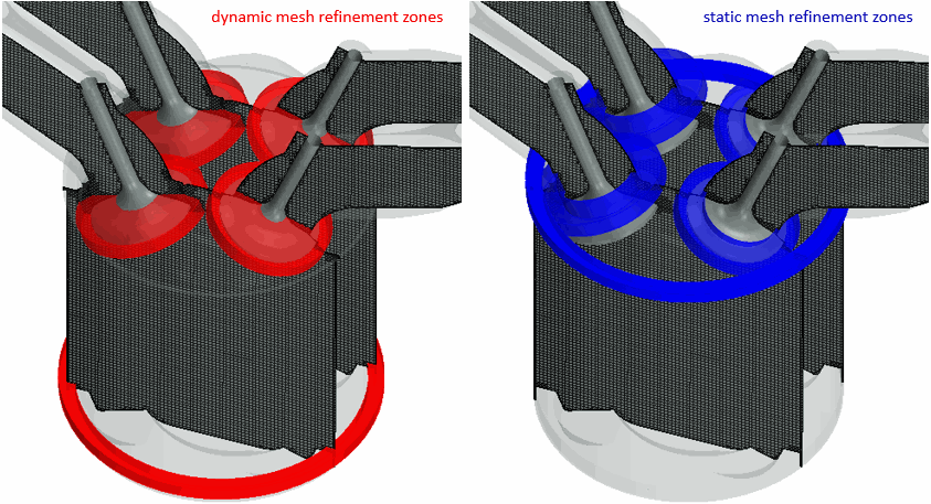 - Dynamic zones follow the moving valves and the piston to ensure a good mesh quality around the valves and the piston crevice for all crank angle positions.
