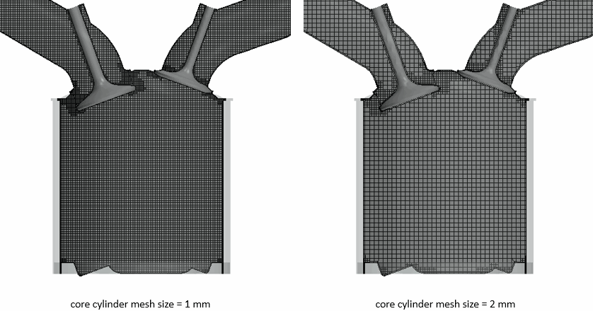 The default mesh settings are based on best practices to ensure a high level of accuracy in the solution with a minimum cell count. However, Simcenter STAR-CCM+ In-cylinder allows you to control specific mesh characteristics, such as the cell size in the cylinder core. The following images display the mesh for a gasoline engine using a core cylinder mesh size of 1 mm (default) and 2 mm, respectively: