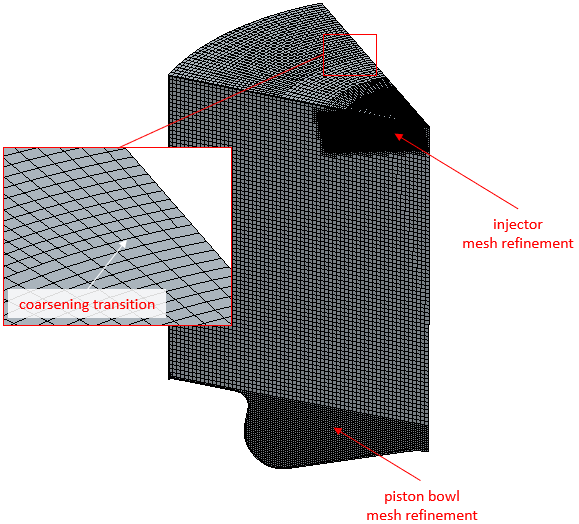 Simcenter STAR-CCM+ In-cylinder applies three rotational sweep coarsening transitions across which multiple cells are merged into a single cell. This method coarsens the mesh as it approaches the axis of symmetry.