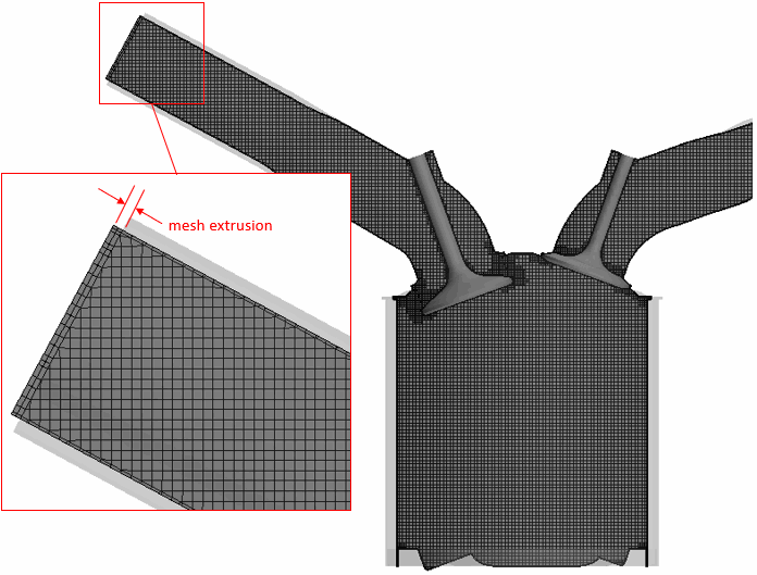 The mesh refinement zones dynamically follow the moving valves to ensure a good mesh quality around the valves for all crank angle positions.