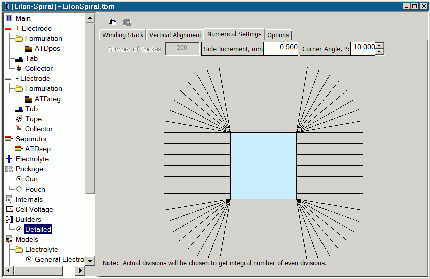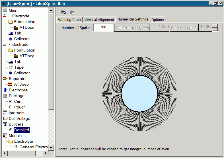 对于圆柱型电池单元,可以指定辐条数。所提供的圆柱型电池单元中的默认值为 50。有效值范围为 50 - 1000。