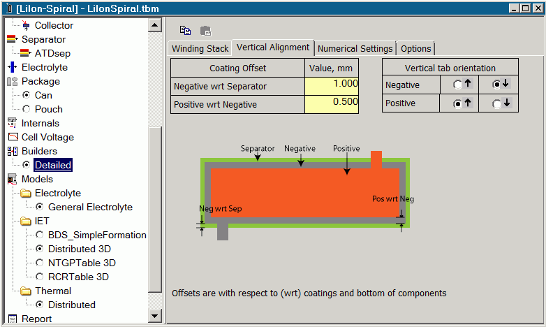 可以在 节点的垂直对齐选项卡中检查极耳的垂直对齐。以下示例显示了默认圆柱型螺旋电池单元,其中的极耳方向相反。