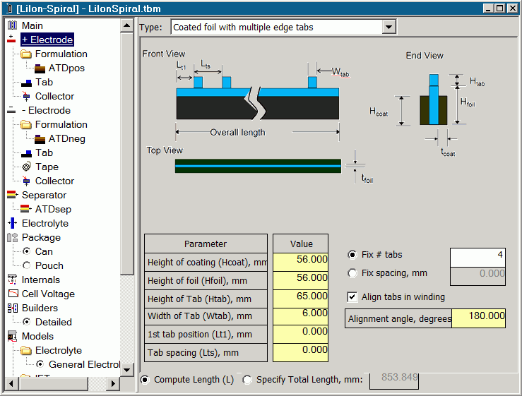 - 要对齐绕组中的极耳,激活 Align tabs in winding(对齐绕组的极耳) 框,然后在 Alignment angle, degrees(对齐角度,度) 框中指定极耳开始的角度。