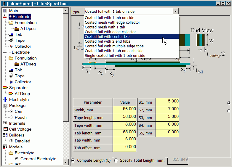 当然,可以为任一或两个电极指定不同的类型。要修改分配给特定电极的极耳类型,选择适当的节点,即 + Electrode(+ 电极) 或 - Electrode(- 电极)。从类型下拉菜单中,选择新的极耳类型。