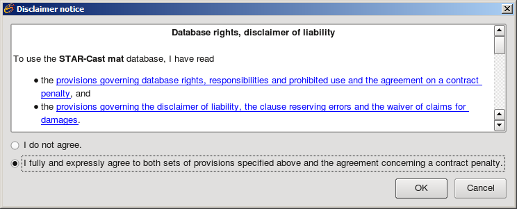 首次打开铸造材料数据库编辑器时,将显示以下免责声明。