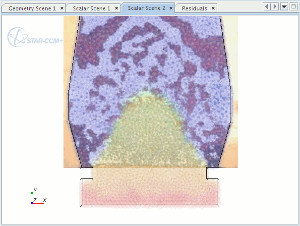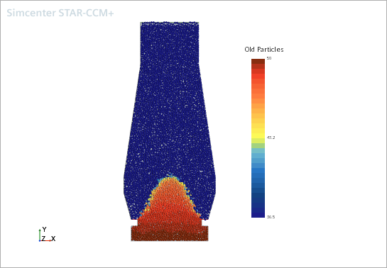 本节将沉降层区域的高度和形状与 Zhou et al. 实验的图像相比较。要更加清楚地显示沉降层区域,请创建用户自定义场函数 oldParticles,此函数用同一颜色显示停留时间小于 36.5 s 的所有颗粒。
