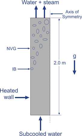 当壁面温度超过水的饱和温度时开始沸腾。此点称为开始沸腾 (IB) 点,此时将开始在壁面附近出现小气泡。当过冷度降低时,在 IB 点的下游,蒸汽的体积分数开始增长。管中的此点称为净蒸汽产生 (NVG) 点。从 NVG 点开始进一步向下游,蒸汽的体积分数以逐渐增加的速率继续增长,并且气泡开始脱离壁面进入液体中。当此脱离发生时,有些气泡冷凝,从而增强对水的热传递。在管顶部存在蒸汽和水的混合物。