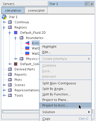 要将边界投影至轴,必须首先将网格转换为 2D,并定义轴类型边界。 选择轴边界节点并单击右键可访问 选项,如下所示: