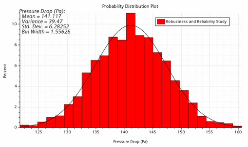 在概率分布绘图中,可以将响应的预期分布与正态分布进行比较。如果条形图低于设计响应的正态分布,则输入参数的原始设计值可以认定为可靠。每个响应需要一个单独的概率分布绘图。