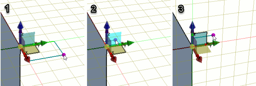 In the example below, the active plane is changed from the XY plane in (1), to the ZY plane in (3). Clicking on the plane ZY plane selector in (2) makes this change.
