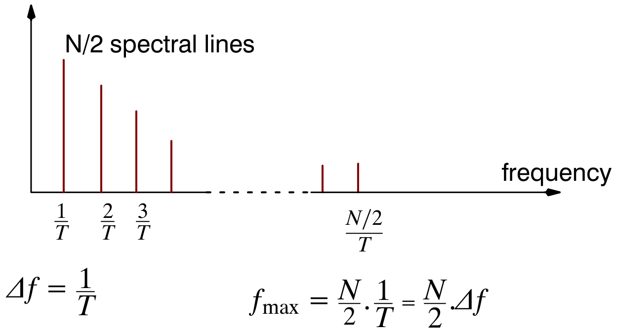 The frequency spacing between the spectral lines is therefore 1/T, and the highest frequency that can be determined is (N/2) · (1/T).