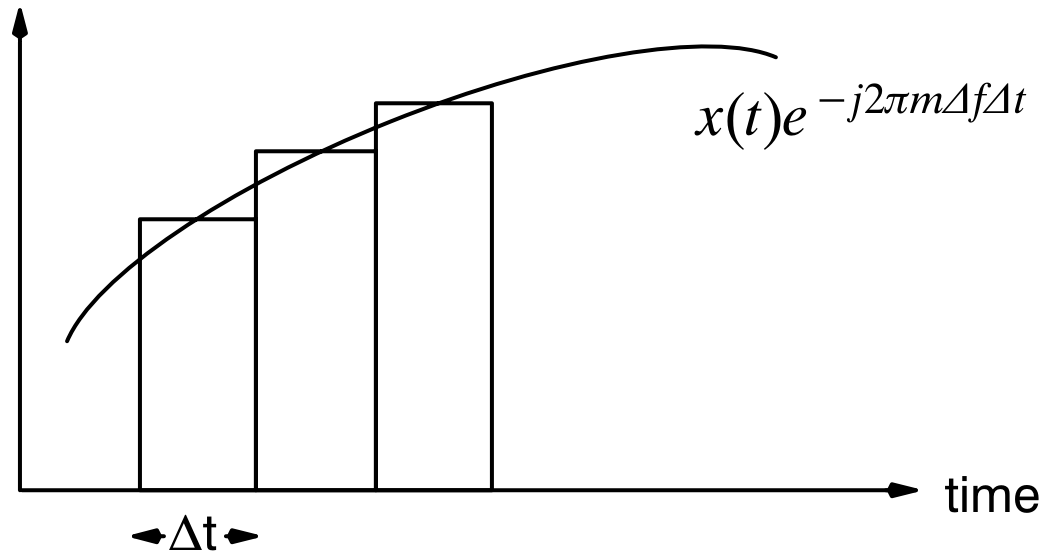 The digital computation of the Fourier Transform is called the Discrete Fourier Transform. It calculates the values at discrete points (mΔf) and performs a numerical integration as illustrated below between fixed limits (N samples).