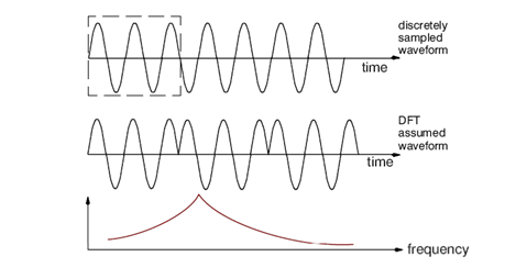 Because the signals are measured over a sample period T, the DFT assumes that this is representative for all time. When the sine wave is not periodic in the sample time window, the result is a consequent leakage of energy from the original line spectrum due to the discontinuities at the edges.