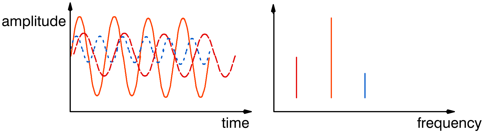 Signals can be expressed as oscillating changes of signal strength over time or as a function of signal strength over a range of frequencies. Both methods have their uses. Information can be converted from one form to the other by Fourier transforms.