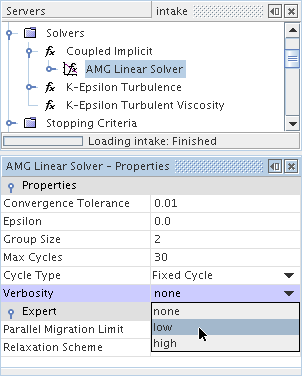 Simcenter STAR-CCM+ 中对传输方程离散化后得到的代数线性方程组进行求解的求解器依赖于代数多重网格 (AMG) 线性求解器。 Eqn. (2514) 描述的残差测量也表示这些线性方程的求解。 在某些情况下,最好监视这些残差。 要监视残差,打开所需求解器下的 AMG 线性求解器节点。 然后在属性窗口中,将详细属性设为低。