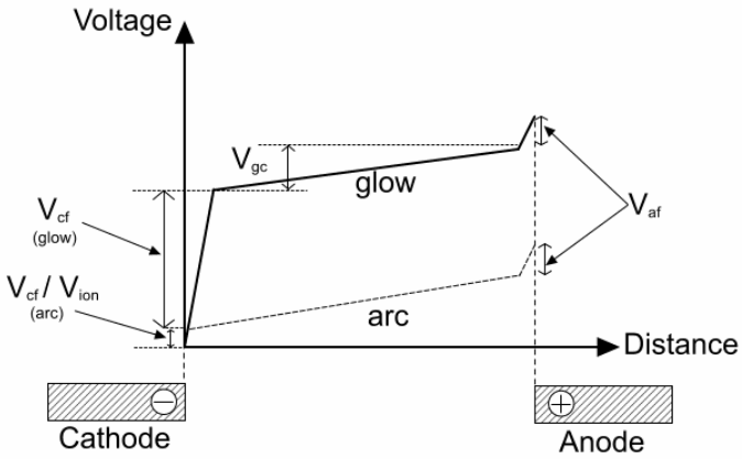 the ionic potential of the cathode, and the gas column voltage, respectively. The