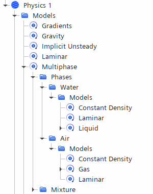 在两种情况下,均使用适合各相的默认材料(以水作为液相而以空气作为气相),因此无需对材料特性做进一步的更改。要查看所选模型,可展开相父节点中的水和空气节点。