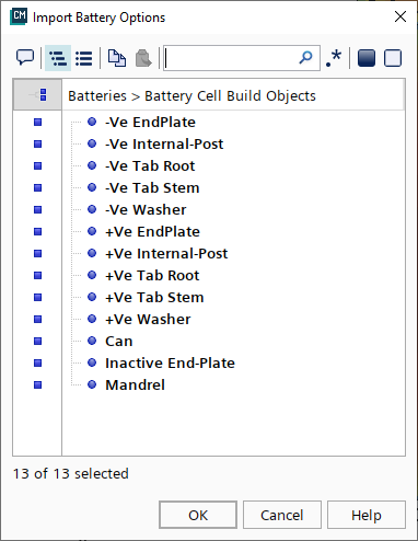 在导入电池选项对话框中,确保选择所有对象,然后单击确定。