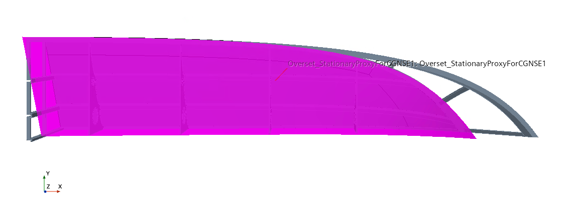 Simcenter STAR-CCM+ 将在网格场景窗口中高亮显示选定区域。只有一个外部区域对应于固体船体区域:Overset_StationaryProxyForCGNSE1。