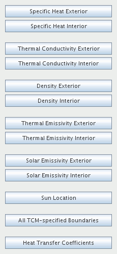 这些按钮可生成显示车辆外部或内部固体的比热、导热率或密度轮廓的场景。 外部场景包括名称中不含“road(道路)”且位于模型外部的所有固体区域;它适用于其中的窗户、门以及其他面板要作为固体建模的模型。 内部场景用于在模型内部的固体区域上显示轮廓,这些固体区域被标识为名称中含“seat(座位)”的区域。 如果模型中没有固体区域,这些按钮不会激活。