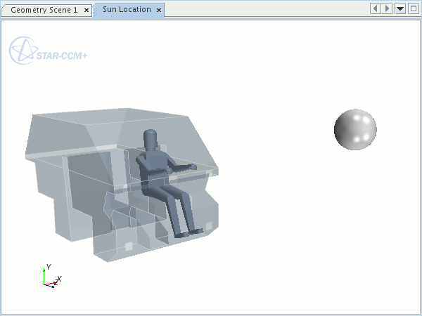 对于已通过使用太阳能负载模型将太阳包括在模拟中的情况,可以使用太阳位置按钮来提供太阳位置的视觉指示。 太阳在模型中由一个球体表示,其位置根据太阳能负载属性中指定的方位和 Altitude Angles(高度角) 自动计算得出。