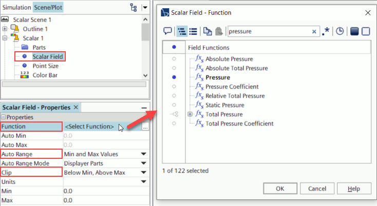 对于标量或矢量显示器,如果不想在对象树中选择场函数,则可以在场景中单击颜色条,然后在颜色属性对话框中设置场函数。