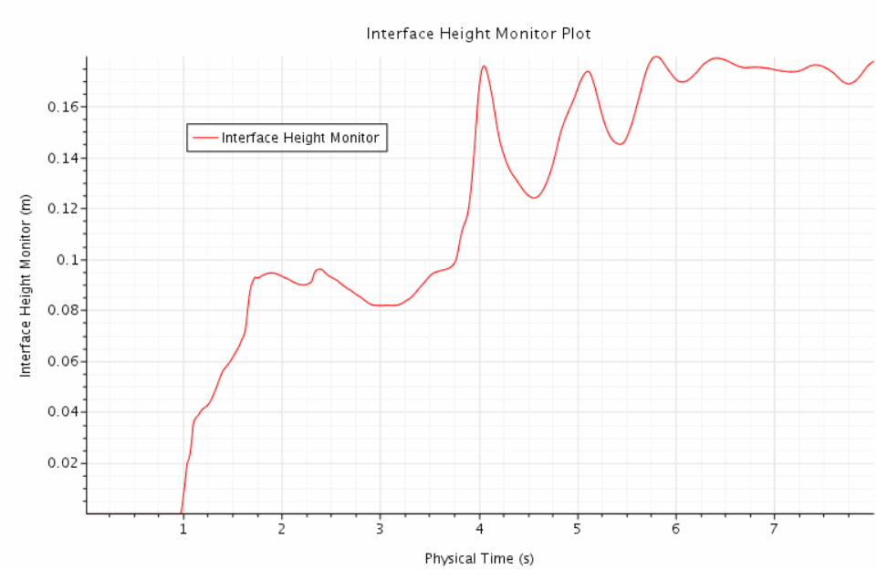 以下所示交界面高度监视器绘图记录了在水流进入测试段水平部分位置的水-空气交界面的高度。该绘图显示逆流的周期性行为。