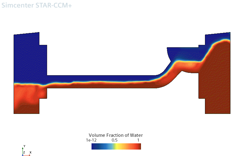 该场景显示从右向左的冷却水流以及反方向的空气流。分层流区域、离散液滴和离散气泡全部存在。未求解的液滴和气泡清晰可见,并在测试段连接蒸汽发生器入口腔室的位置可以看到滚动波。
