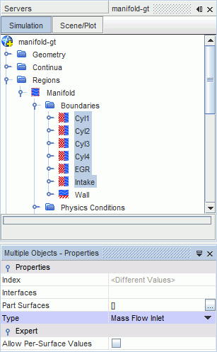 同时选择 Cyl1、Cyl2、Cyl3、Cyl4、EGR 和 Intake 节点,并将类型设置为质量流量入口。