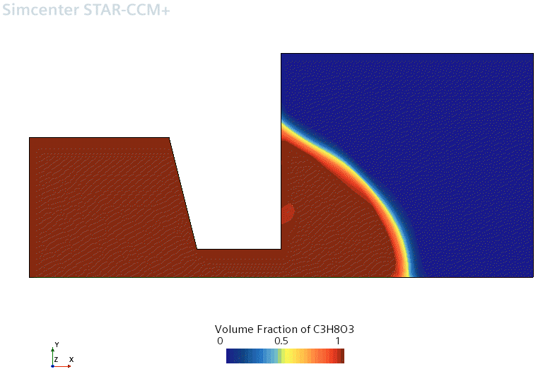 在运行 2.0 s 结束时,标量场景 1 屏幕显示甘油体积分数分布。观测到的接触角的确接近 45o。
