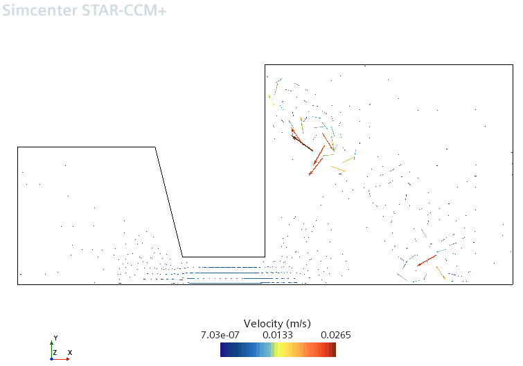 速度矢量图显示高空气流速接近自由表面。这些数字不精确性称作附着流。这些附着流的出现是由于表面张力和压力比动量方程中的所有其他项都大得多,并且由于整个自由表面压力的不连续变化和与其相关的离散误差较大,其在不规则网格上很难达到数值平衡。当问题尺寸较小且流体速度和粘度较低时,附着流会很明显。对扩散和对流力与表面张力幅值相当的流体来说,这些问题并不明显。由于只在空气中产生人为速度,所以其对流体(通常是您要预测的)的影响不大。