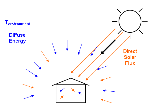 此外,可使用表面至表面传递模型对与周围环境的辐射交换建模(参见以下示意图)。 可同时考虑地面发射和太阳发射。 普朗克分布控制整个热光谱内的太阳和地面发射的分布。 太阳发射跨整个热辐射光谱,包括 UV、可见光和 IR 范围。