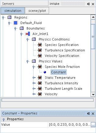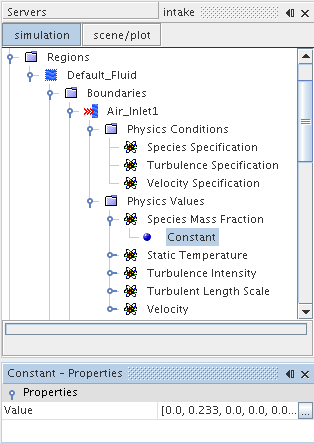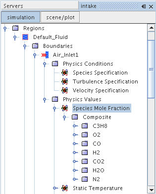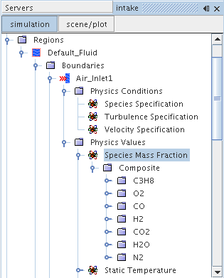 This node is added to the Initial Conditions node of physics continua, and to the Physics Conditions node of flow boundaries, after you have selected components for the mixture.