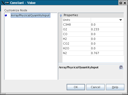 As for the Species Mass Fraction, the property customizer can be accessed by clicking the ellipsis to the right of the Value property array. This opens an input editor that identifies the different components in the array.