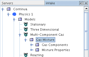 A particular species is defined as one component in a multi-component gas mixture or liquid mixture. For a gas, the component collection is held within the Gas Mixture node of the Multi-Component Gas model node in the Models tree of the relevant physics continuum. These nodes are shown below. For liquids, this arrangement becomes the Liquid Mixture node of the Multi-Component Liquid model node.