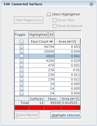 要在总结表中高亮显示选定面,应先生成相连表面诊断。 然后,可以在图形窗口中选择所需的面,并单击高亮显示已选内容。 此选项将在总结表中高亮显示相应的条目。