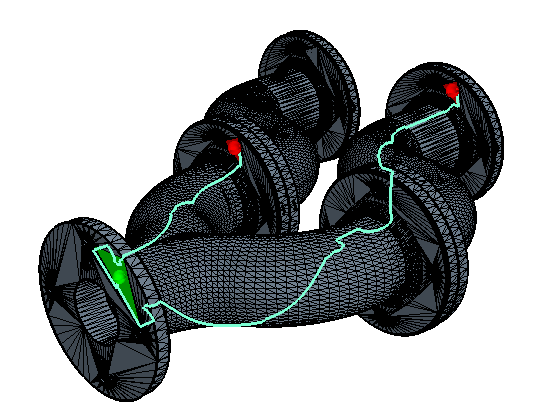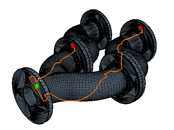 该段路径根据漏洞路径面的边形心生成。 源面和目标面的形心处会显示一个彩色球体,以便在关闭“发现漏洞路径”工具后仍能识别这些面。 漏洞路径的颜色不同于其余表面修复为诊断和零部件表面着色时所用的颜色映射。 这种颜色差异最大程度地减少了同时查看段路径和修复过程中的其他着色选项时的颜色冲突。