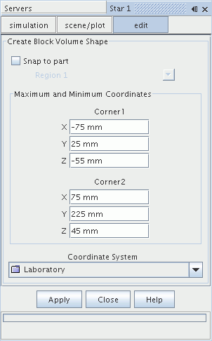 要定义方块,根据全局笛卡尔坐标系或局部坐标系指定两个独立位置(对角点的最大和最小坐标)。 可以将这些位置手动输入对话框中,也可使用点工具将面中心球以图形方式拖到适当位置。 按创建按钮可在体形状节点下创建名为 Block 1(方块 1) 的新节点。 可根据需要重复此过程任意次,以创建更多方块形状。 按关闭按钮可完成该操作。