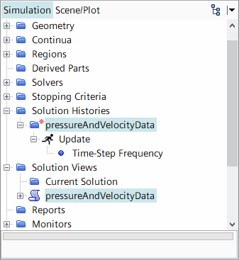 求解历史节点中一个将显示使用模拟历史文件名称的新子节点。同时,同名的求解视图节点添加到求解视图节点中。在以下示例中,模拟历史文件的指定名称为 pressureAndVelocityData。