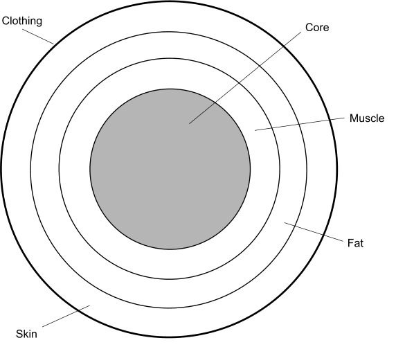 头部视为含四个壳体的球体。 中枢血管系统为单独元素。 通过血液循环,中枢血管系统负责在人体轴向上传递热。