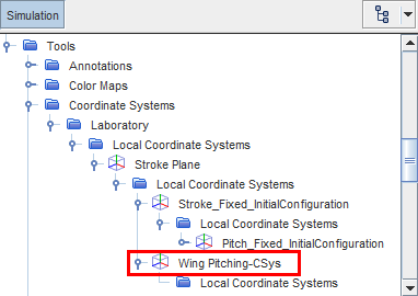 修改机翼俯仰坐标系的属性,使其根据初始冲程角度定向。作为快捷方式,可以将 Stroke_Fixed_InitialConfiguration节点的属性复制并粘贴到机翼俯仰坐标系节点上。