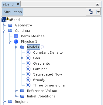 选择物理模型 为不可压缩流体选择模型。 已在网格生成过程中自动创建物理连续体。要选择物理模型: 右键单击连续体 > 物理 1 > 模型节点并按顺序选择以下模型: 组合框 模型 时间 定常 材料 气体 流体 分离流 状态方程 恒密度 粘性项 层流 单击关闭。 现在将显示选定模型。