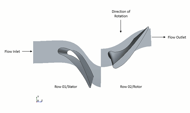 本教程所采用的几何旨在表示一个简化的涡轮级(总温和总压力分别为 700 K 和 50000 Pa)。流体沿 z 轴以轴向进入网格,初始速度和静态温度分别为 50 m/s 和 500 K。由于与叶片的相互作用以及定子和转子的曲率,流体在该阶段中冷却。