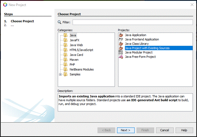 在 New Project(新建项目) 向导中,选择 Java Project with Existing Sources(基于现有源的 Java 项目),然后单击下一步。