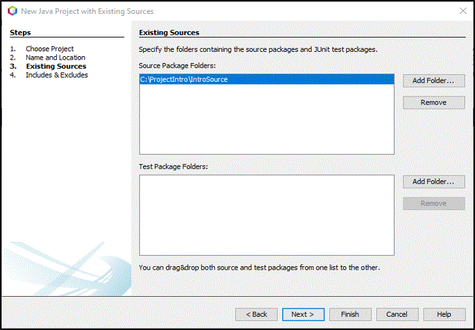 在 Existing Sources(现有源) 面板中,单击 Source Package Folders(源包文件夹) 的 Add Directory(添加目录) 按钮,添加先前创建的源目录,然后单击下一步。
