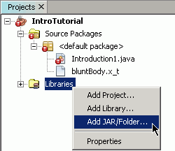 在 NetBeans 的 Projects(项目) 面板中,右键单击库,然后选择 Add JAR/Folder(添加 JAR/文件夹)。